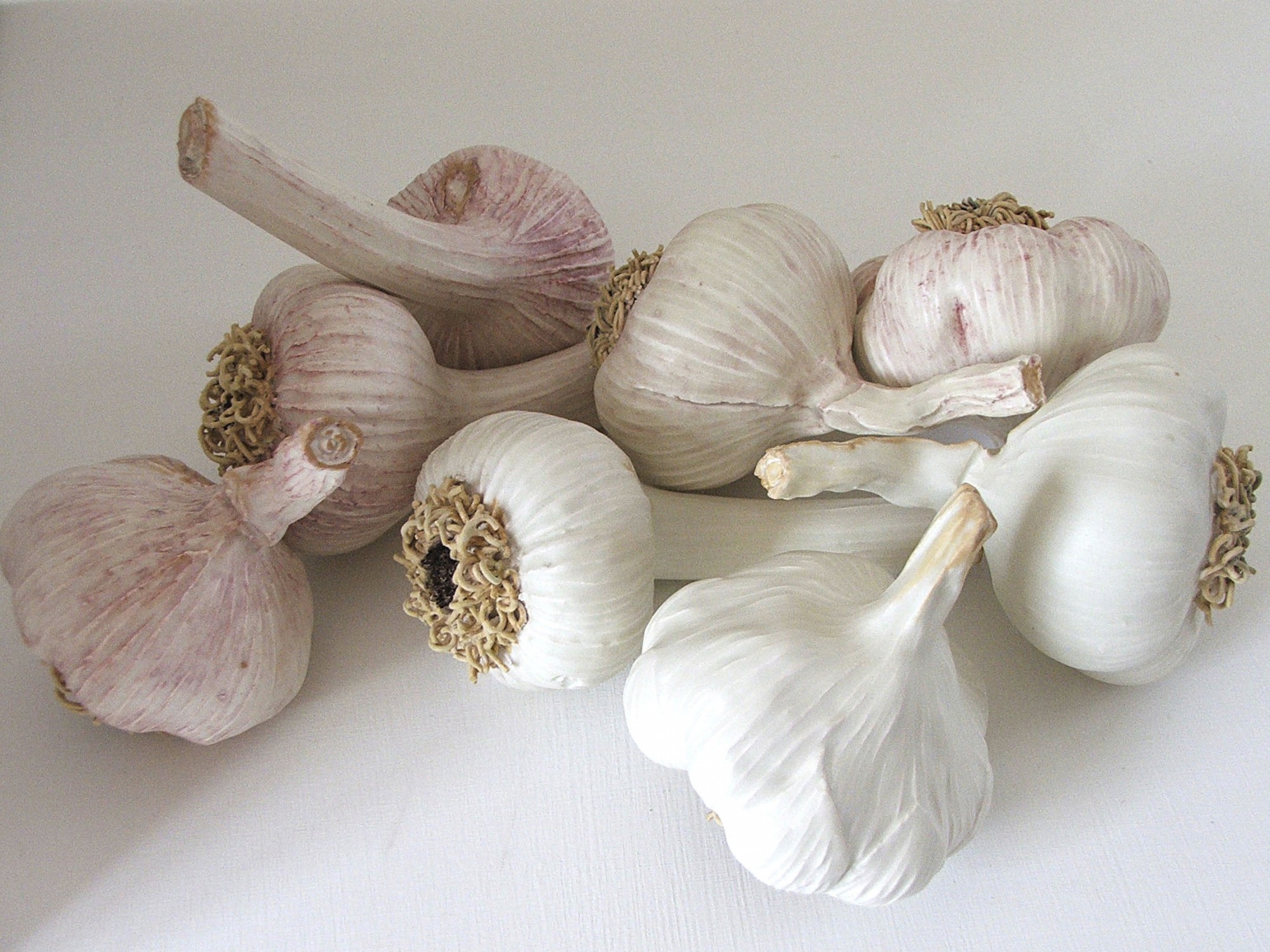 Image 1: Group of Garlic, cast in clay then hand painted and glazed. Available in white or pink.