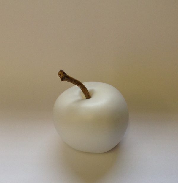 Matt white windfall apple with a short stalk cast in pewter, which is then hand painted  – £48.00. Height, (not including stalk 4cm) Pictured with regular size white apple.